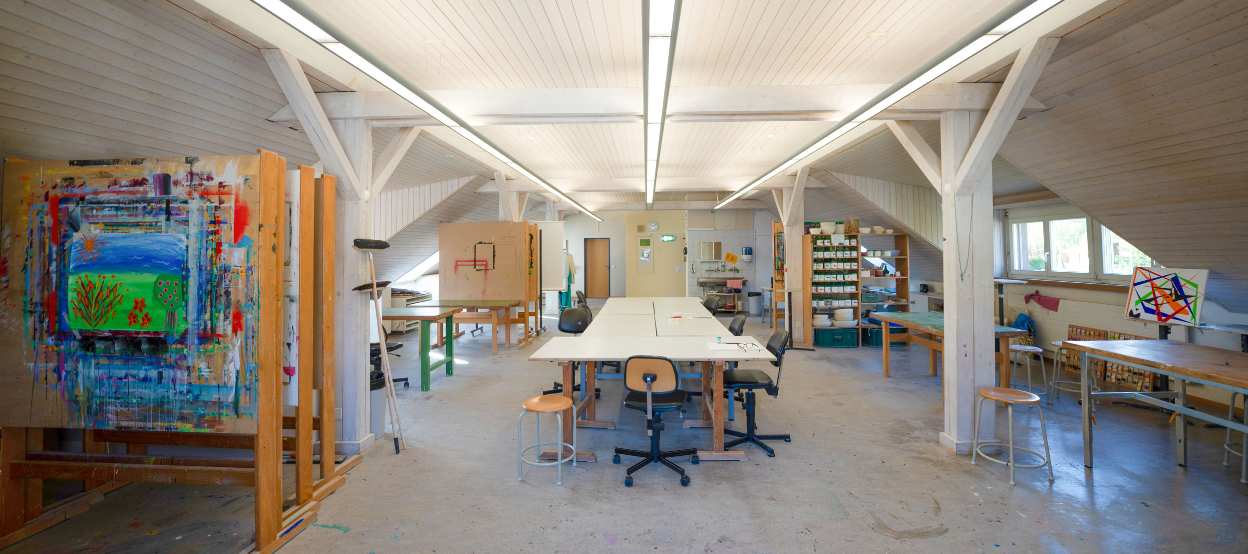 - Werkateliers, Velos, Bibliothek, Gymnastikhalle, Fitnesszentrum, Aufenthaltsräume