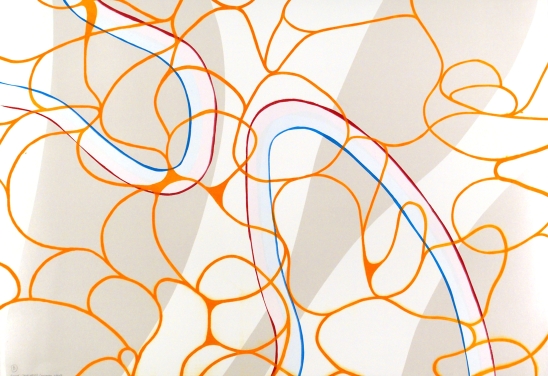 Eine organische Struktur aus Kreisformen, die sich durch Verdichtung und Ausdehnung miteinander verweben, bedeckt ohne Zentrum und Rand die gesamte Bildfläche. Sie erinnert an eine vergrösserte Mikroskopie eines Zellschnitts oder organischen Gewebes. Hofmanns Kunst verbindet – basierend auf seinen früheren Erfahrungen in der Pharmaforschung – ein naturwissenschaftliches Interesse mit einer ästhetischen Auseinandersetzung mit der Malerei.
