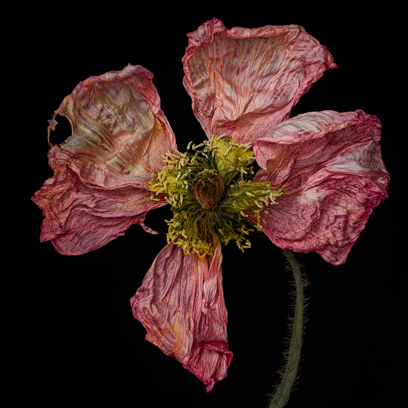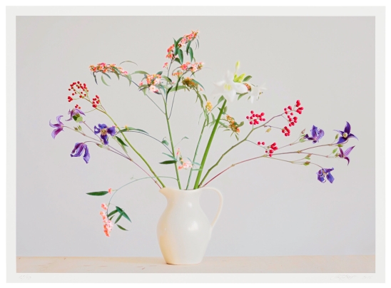 Ihre leuchtende, farbenfrohe Erscheinung verdanken die Blüten einem sorgfältig entwickelten Trocknungsprozess. Dieser Prozess, der in der Fotografie als Farbe und Kontur, Struktur und Tiefe dauerhaft sichtbar bleibt, hat real im Atelier stattgefunden. Die Blume existiert ebenso wie die Farbe oder die Tiefe. Alle Fotografien entstehen ausschließlich bei Tageslicht. Die Blüte verschwindet nicht in einem substanzlosen, künstlich eingefügten schwarzen Hintergrund, sondern taucht – sowohl real als auch optisch – in eine greifbare Dunkelheit ein. Das Ergebnis ist ein besonders gesättigtes Schwarz. Die Umsetzung im Druck erfolgt als Dye Transfer Print oder als Archival Pigment Print auf speziellen Baumwollpapieren und erfordert eine enge Zusammenarbeit mit den Drucklaboren.