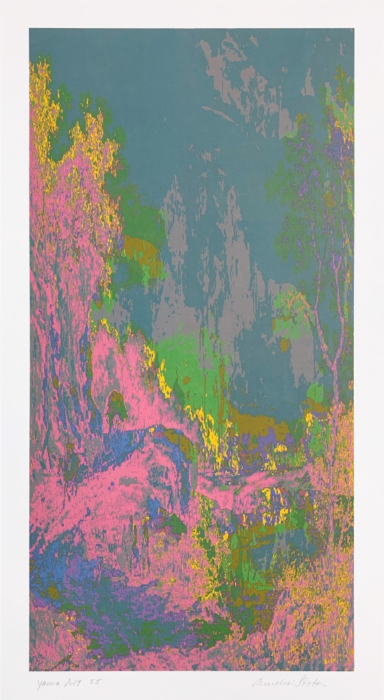 Der Siebdruck in sechs Farben, der beim Meisterdrucker Lorenz Boegli produziert wurde, offenbart einen satten Farbauftrag. Dieser erinnert in seiner farblichen Haptik beinahe an einen Holzschnitt, bevor man bei genauerem Hinsehen das Raster entdeckt. Die Assoziation des ungewöhnlichen Formats mit fernöstlichen Rollbildern liegt nahe – ebenso wie durch den Titel Yama. Die Idee, das Foto als Siebdruck umzusetzen, entstand aus der Tatsache, dass die Verfremdung des Bildes fast pixelartig wirkt, was sich mit einem Siebdruckraster spannend übersetzen lässt. Die malerischen Komponenten des Fotos sind dabei unübersehbar – und gerade hier zeigt sich das faszinierende Zusammenspiel von Fotografie, Malerei, Zeichnung und Druckgrafik.