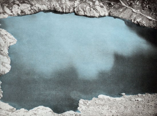 Diese Seelandschaft ist Teil einer fünfteiligen Serie farbiger Heliogravüren, die auf einer Reise entstanden ist. Jedes Motiv erhält durch die Umsetzung eine spezifische Farbigkeit und vermittelt somit eine eigene Stimmung: Blütenzweige, die sich im Wasser spiegeln, eine Pfingstrose, ein Pfau, eine Wohnsiedlung, ein Bergsee. Als Serie vermitteln sie eine besondere Atmosphäre des In-der-Welt-Seins – Momente, Augenblicke, Orte, die weder zeitlich noch geografisch eindeutig einzuordnen sind. Es sind zart eingefärbte Erinnerungs- und Denkstücke, wunderbare malerische Eindrücke, weder fern noch nah.