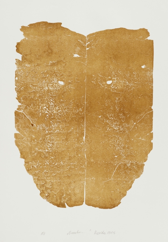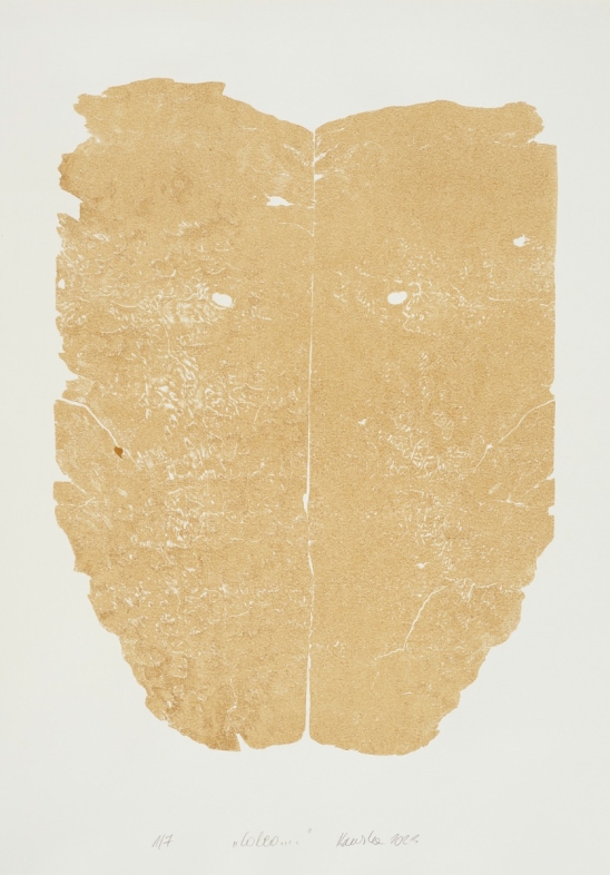 Die Edition von Renata Kaminska zeigt den imposanten Abdruck eines afrikanischen Mahagoni-Wurzelstocks. Die ovale Form mit den feinen, haptisch erfahrbaren Furchen der Maserung ist in beiden Drucken identisch. Das Motiv erinnert an wissenschaftliche Mikroskopaufnahmen menschlicher Zellen und inszeniert die Wurzeln als innere Organe der Bäume. Die beiden Werke unterscheiden sich in ihren Titeln sowie in der Intensität der Farbe, die an den Farbton von Tropenholz angelehnt ist. Nach dem Druck des dunkleren Werks Bombo wurde jeweils mit der auf dem Druckstock verbliebenen Restfarbe das hellere Coleo erzeugt – als Begleiterscheinung, Schatten oder Echo.