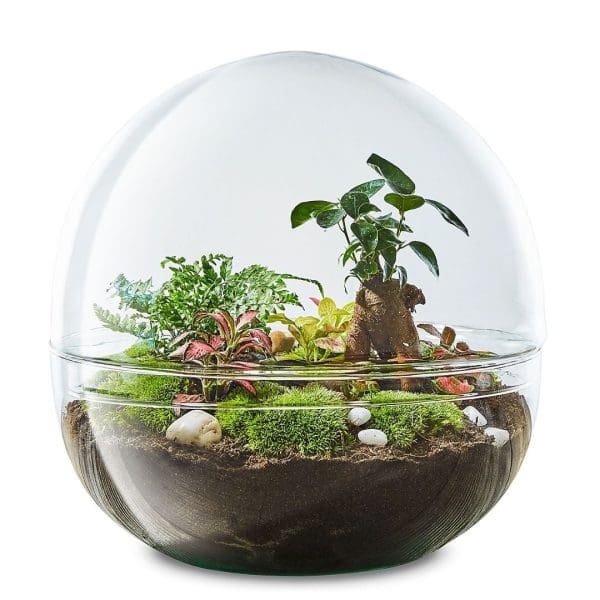 - Fittonien, Moos, Ficus Bonsai und Farn in handgefertigtem Glas aus recyceltem Eco-Glas, 27,5 x 27,5 cm