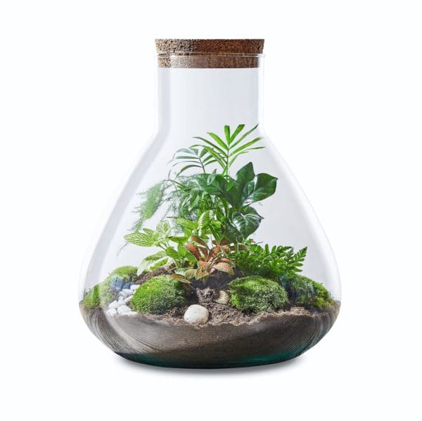 - Fittonien, Moos, Bergpalme, Kaffeepflanze und Spargelfarn in handgefertigtem Glas aus recyceltem Eco-Glas, 32 × 29 cm