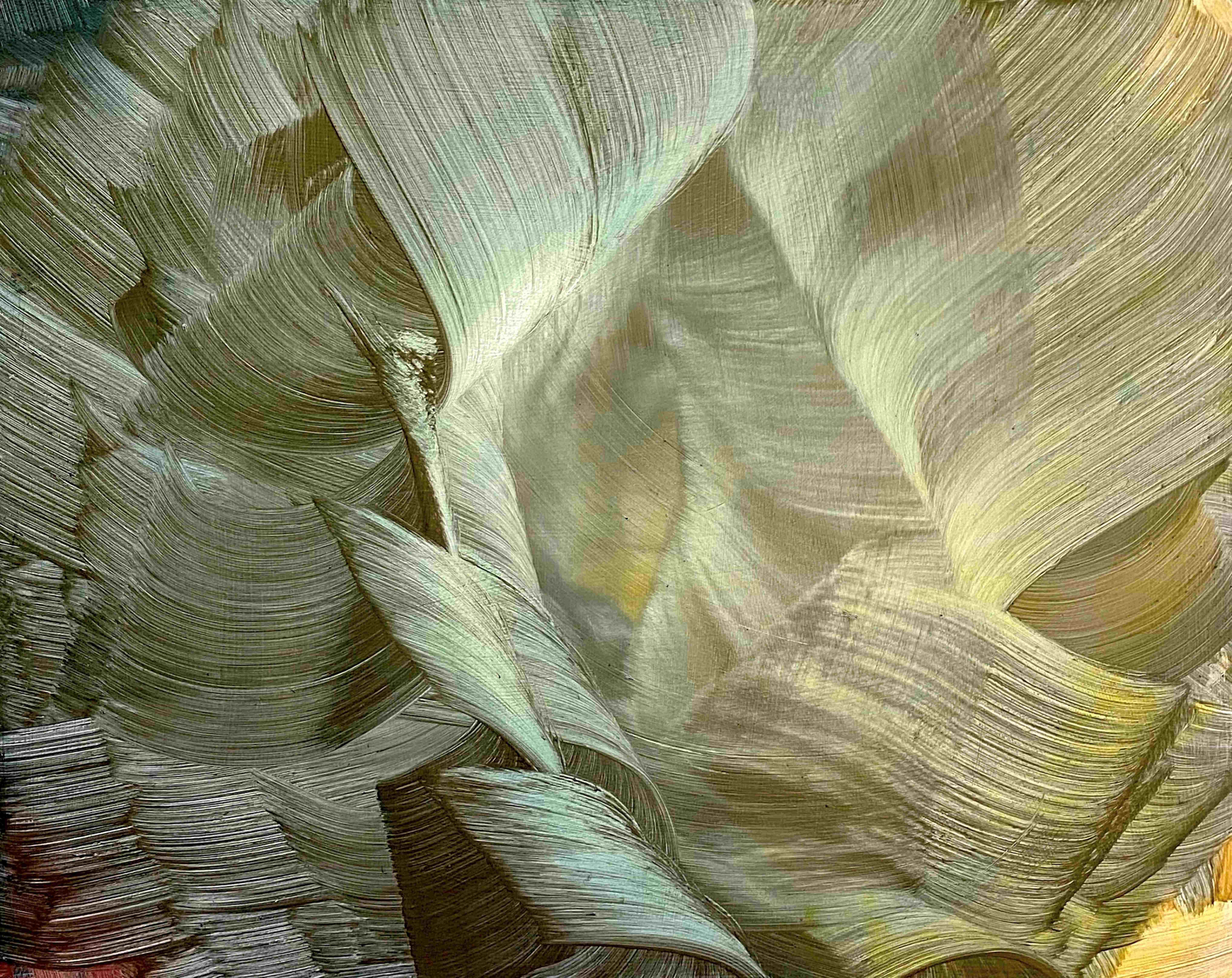 Die seit 2021 entstehende Werkserie «Bloom» nimmt im Œuvre von Isa Dahl eine besondere Stellung ein. Abstrakte Kompositionen aus sich von der Bildmitte aus entfaltenden Farbfeldern überlagern sich zu komplexen, dichten Strukturen. Über den Titel stellt die Künstlerin einen Bezug zum biologischen Prozess des Blühens her und verortet die Arbeiten bewusst im Spannungsfeld zwischen Abstraktion und Gegenständlichkeit. Während zahlreiche Werke der Serie durch starke Farbkontraste geprägt sind, intensiviert die hier präsentierte Arbeit durch eine überwiegend in verschiedenen Grünschattierungen gehaltene Farbigkeit die Assoziation mit Natur. Charakteristisch ist die von Isa Dahl häufig verwendete Nass-in-Nass-Maltechnik (Lasurtechnik): Transparente, nahezu leuchtende Farbschichten werden in rhythmischen, kreisenden Bewegungen übereinandergelegt und verdichten sich zu pulsierenden Bildstrukturen. Ohne konkrete Landschaften darzustellen, eröffnen Dahls Arbeiten einen Resonanzraum für natürliche Phänomene. Assoziationen mit Windbewegungen, Strömungen, vegetativen Anhäufungen oder sich öffnenden Blüten sind in den abstrakten Formationen angelegt. Der reduzierte und zugleich dynamische Pinselduktus spiegelt ein Naturverständnis wider, das von fortwährender Erneuerung geprägt ist, und lässt zugleich ein üppiges wie undurchdringliches Bildgefüge entstehen. Die kontemplative Betrachtung ist ein wesentlicher Teil von Dahls künstlerischem Ansatz. Rhythmische Bewegung und Wiederholung erzeugen in ihren Werken eine Intensität, die den Blick in eine faszinierende Bildwelt hineinzieht.