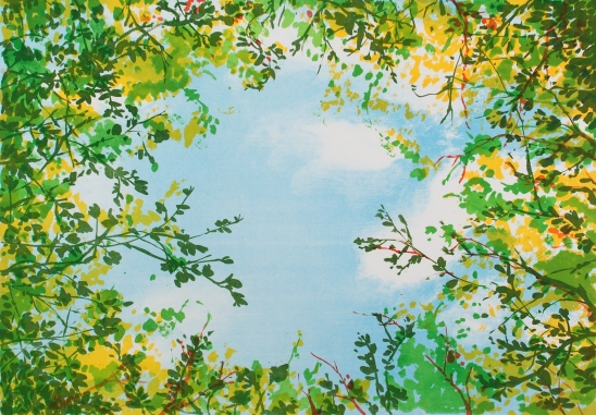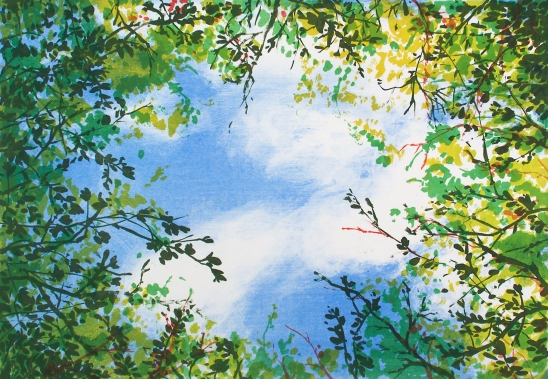 «Lichtung» ist eine druckgrafische Serie, die denselben Waldabschnitt zu drei unterschiedlichen Tageszeiten – am Morgen, am Mittag, am Abend – einfängt. Veränderungen in Farbintensität sowie des Hell-Dunkel-Kontrasts der Äste und der Wolkenformationen lassen die verstreichende Tageszeit als flüchtigen, momenthaften Zustand erfahrbar werden. Dieses Gefühl der Momentaufnahme hängt unter anderem damit zusammen, dass die Arbeiten auf fotografischen Vorlagen basieren. Wie die Titel vieler seiner Arbeiten, z.B. «Lichträume», «Abend» oder «Spiegelung», andeuten, stehen nicht klar definierbare Formen, sondern wandelbare, beinahe immateriell erscheinende Naturereignisse im Mittelpunkt seiner Malerei. In der Werkserie «Lichtung» beschränken sich die Bildmittel auf das Dickicht der Bäume und den Raum, den sie umgeben. Bei der Lichtung handelt es sich hier nicht um einen Ausblick, sondern um einen hellen Fleck innerhalb eines dichten Geflechts aus Geäst und Unterholz. Während der Licht-Raum seine Form erst im Verhältnis zu den umgebenden Elementen entfaltet, wirken die Silhouetten der Äste wie abfotografiert und bilden dennoch gleichzeitig eine freischwebende abstrakte Farbfläche, die Raum und Wahrnehmung hinterfragt. Sie sind erkennbar und dann auch wieder dem Blick entzogen. Formen stellen sich als temporär dar, sie sind schwer zu fassen: Aus der Distanz wirken die Szenen fast plastisch und realistisch, bei näherer Betrachtung lösen sie sich jedoch in übereinandergelegte Farbflächen auf. Verschiedene Grüntöne sind nach Hell-Dunkel-Kontrasten geschichtet, während die sichtbaren Fingerabdrücke des Künstlers den malerischen Akt und zugleich den abstrakten Charakter der Arbeiten betonen. Die Grenze zwischen dem fotografisch Fassbaren, dem ins Malerische Übersetzte und dem, was allein den Bedingungen der Natur folgt, wird bei der Betrachtung bewusst erfahrbar.