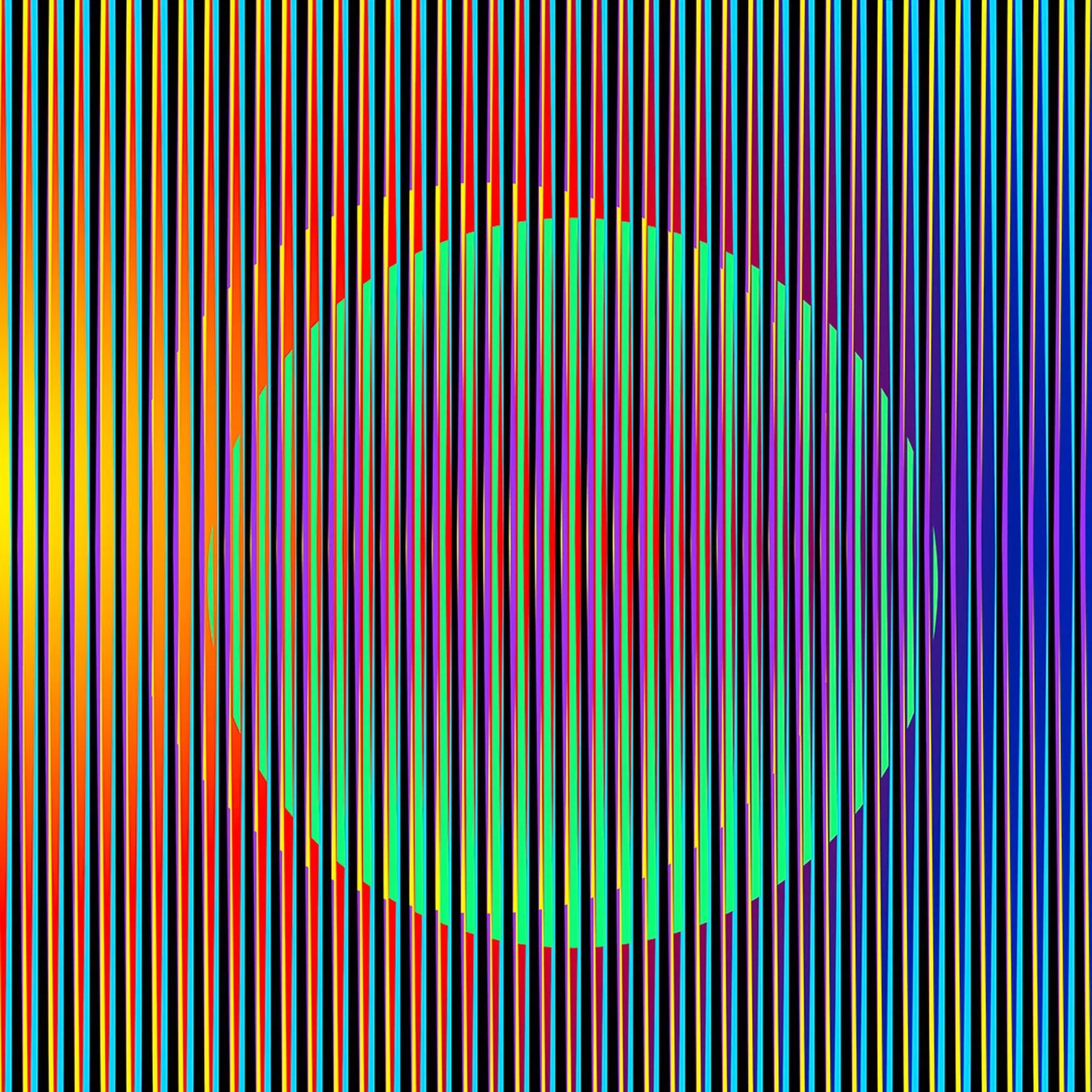 Die Leidenschaft für Licht, Farbe und Bewegung hat Pedro Blas bereits in seiner Kindheit entwickelt, inspiriert von den farbfrohen Landschaften Venezuelas. Die Beobachtung der sich ständig verändernden Farben des El Ávila-Berges und des Caracas-Tals stärkten seine sensorische Verbindung zur Natur und wirkten prägend auf seine Kunst. Den Eindruck von Bewegung und Wandelbarkeit in der Natur versucht Blas nicht nur in seinen künstlerischen Arbeiten einzufangen, seine Umsetzung im Grafikdesign führte für ihn zu grossem Erfolg und brachte ihm Aufträge für internationale Marken ein. Beeinflusst von der kinetischen und optischen Kunst von Carlos Cruz-Diez und Jesús Rafael Soto verbindet Blas traditionelle malerische Ansätze mit digitalen Technologien. Der Entstehungsprozess der «Chromatic Eclipse» ist eine faszinierende Reise von mathematischen Funktionen zur physischen Sensation. Im virtuellen Raum entwickelt der Künstler mithilfe spezialisierter Software komplexe Algorithmen zur Erzeugung von präzisen Farbrastern und chromatischen Linienstrukturen, die den Eindruck von rhythmischer Bewegung hervorrufen. Der entscheidende Schritt zur kinetischen Kunst erfolgt schliesslich bei der Kaschierung: Das angefertigte Bild wird unter einer Schicht aus hochwertigem Acrylglas versiegelt, die eine schützende Schicht bildet, die Farben zum Leuchten bringt und dem Bild Tiefe verleiht. Erst durch das Zusammenspiel von geometrischem Muster und Licht entsteht beim Betrachten im Vorbeigehen der Bewegungseffekt: Die Farben scheinen zu schwingen und das statische Bild wird optisch lebendig.