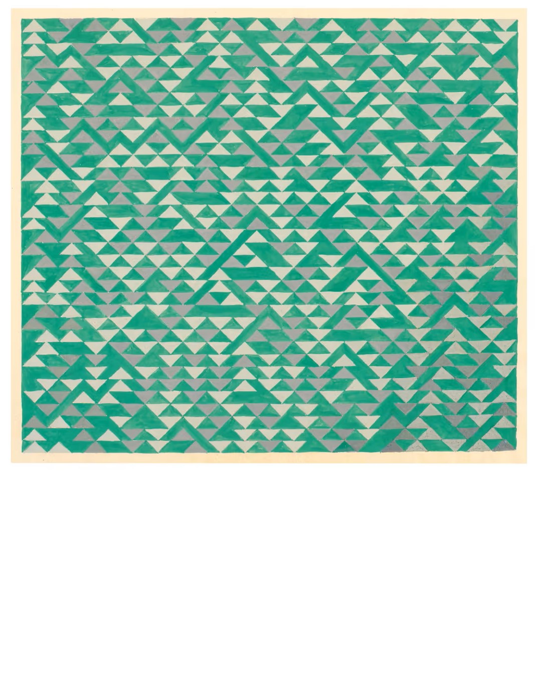 In der als Entwurf für eine Wandtapete entstandenen Farbstudie «Triadic II» hat Albers lediglich drei Farben – Grau, Grün und Sand – zum Einsatz gebracht. Auf einer grünen Fläche sind graue und sandfarbene Dreiecke in scheinbar unsystematischer Reihenfolge und in aufrechter und kopfstehender Ausrichtung über die gesamte Bildfläche verteilt. Durch die wechselnden Farbkontraste entstehen rhythmische, sich wiederholende, alternierende Muster, die an textile Strukturen oder Raster erinnern, wie sie durch das Geflecht von Kett- und Schussfäden in der Weberei entstehen. Anni Albers entwickelte ihre zentralen Farb- und Materialkonzepte, wie sie auch in «Study for Triadic II» sichtbar werden, während ihrer Zeit am Bauhaus in den 1920er-Jahren. Mittels einer neuartigen Verbindung von traditioneller Webkunst und modernistischer Abstraktion macht sie die Farbwirkung in ihren Arbeiten auf taktile Weise erfahrbar. Muster und Farbeffekte, wie sie in der Webtechnik durch die Verbindung der Längs- und Querfäden entstehen, sind bei ihr stets konstruktiver Teil der Komposition. Ausgehend von der Ästhetik der Webkunst, in der die Farbwirkung aus einer untrennbaren Einheit der materiellen Beschaffenheit des Webfadens und der strukturellen Organisation im Webprozess erwächst, thematisiert die Druckgrafik «Study for Triadic II» die textile Sinnlichkeit mit einem anderen Medium. Häufig verwendete Albers eine Palette aus Erdtönen wie Ocker, Moosgrün, Terrakotta und Sand, inspiriert von den Landschaften Mexikos und präkolumbianischen Textilien.