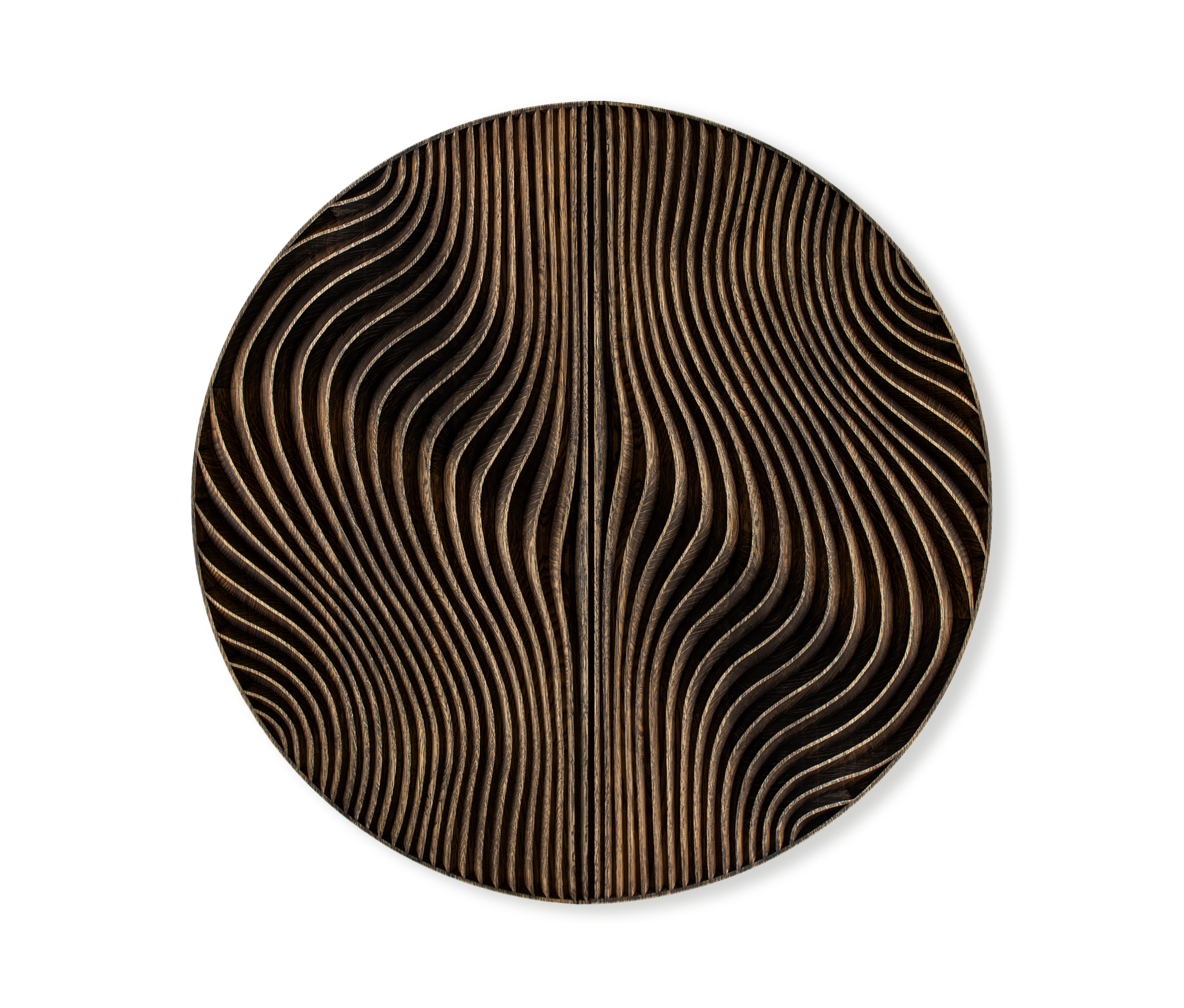 Die äusserst minimalistische Wandinstallation «Interconnection» ist eine aus massiver Eiche geschnitzte Arbeit (Carving), die die natürliche Struktur und die rhythmische Form der Holzmaserung aufnimmt und daraus neue Bedeutungsebenen entstehen lässt. Inspiriert von den Worten des römischen Philosophen Lucius Annaeus Seneca – Wir sind Wellen desselben Meeres, Blätter desselben Baumes, Blumen desselben Gartens – übersetzt die Arbeit ein philosophisches Naturverständnis in eine haptisch erfahrbare Form. In das Holz eingeschnittene, sich wiederholende geschwungene Linien strukturieren die Oberfläche und verweisen auf kontinuierlich und zyklisch wiederkehrende Wellenbewegungen. Das Werk besteht aus zwei identischen Halbkreisen, die vertikal und spiegelverkehrt zusammengefügt sind. Dadurch entsteht ein gegenläufiger Rhythmus: Auf der rechten Seite breitet sich der Wellenschlag von oben nach unten aus, während er sich auf der linken Seite in umgekehrter Richtung entfaltet. Dennoch verbinden sich die beiden Hälften zu einem harmonischen, untrennbaren Ganzen. Die Materialität der Eiche bleibt bewusst sichtbar und spürbar. Die Oberflächen der erhabenen Wellenstrukturen sind mit feinen Schraffuren versehen und erzeugen, ohne dass man sie berührt, eine taktile Wahrnehmung. Licht und Schatten reagieren sensibel auf die reliefartige Struktur und lassen das Werk je nach Blickwinkel lebendig erscheinen.