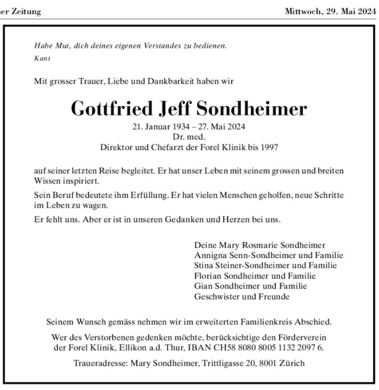 In der Traueranzeige wird das grosses Engagement Sondheimers für seinen Beruf und die Forel Klinik hervorgehoben und es wird gebeten, dem Förderverein Forel Klinik in seinem Namen zu gedenken.
